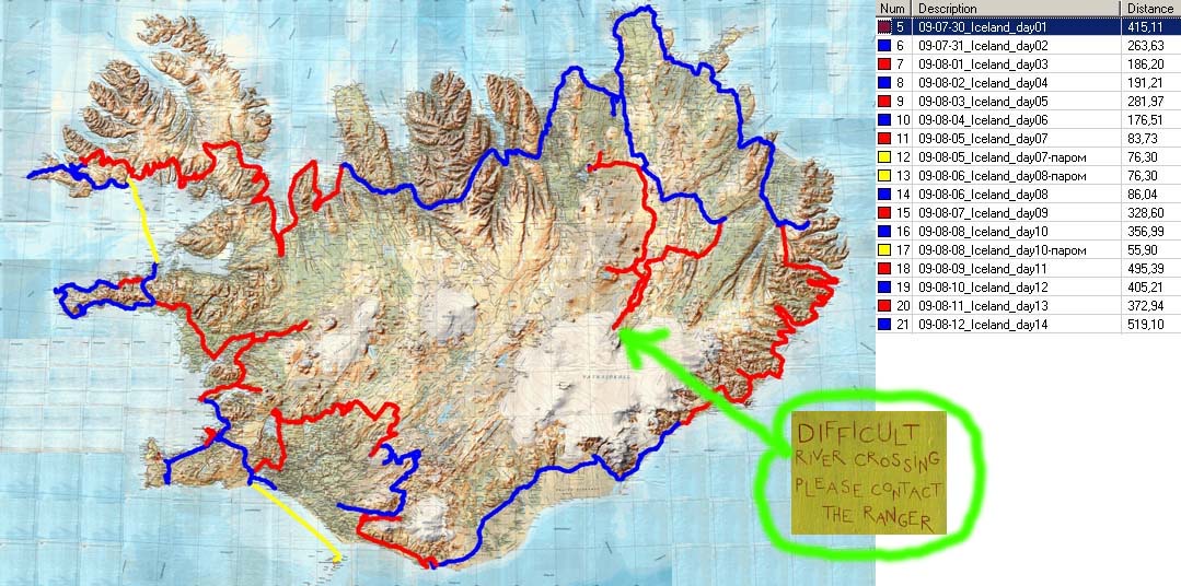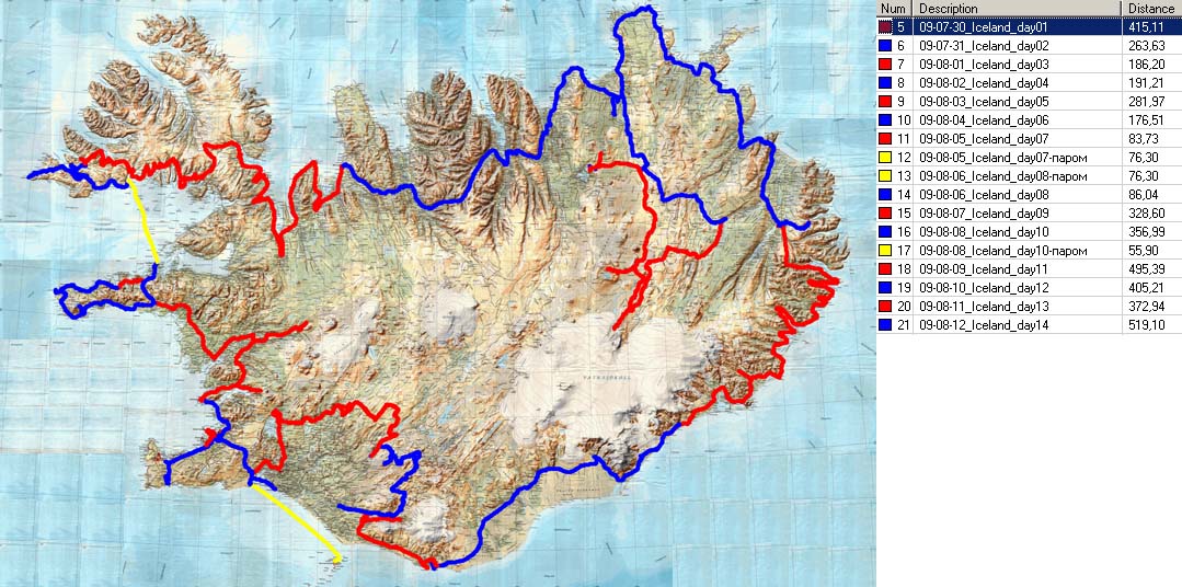 Маршруты с километрами, которые мы прошли по Исландии: