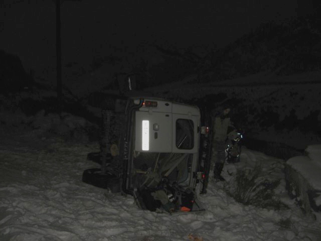 Но недолго романтика длилась: на очередном прижиме Вова закусился с плетущимися легковушками и в итоге, пока их обгоняли, положили Кузю на бок. Обгоняемый балбес резко взял влево в повороте, так что выбор был невелик: либо в бочину, либо в сугроб. Сугроб выглядел привлекательнее, да и совсем нестрашно, для Кузи на его-то лаптях)) Но.... Уазик зарезало в сугробе, стянуло в сторону, он зацепился левым колесом за щель в бетонном ограждении, замялся диск, зажевало и порвало покрышку - как результат разворот и плавное приземление на жесткие камни. Все, конечно, остались живы-здоровы, вылезли, раскидали по-быстрому машину и стали ждать помощь: самим было поставить его на колеса нереально.