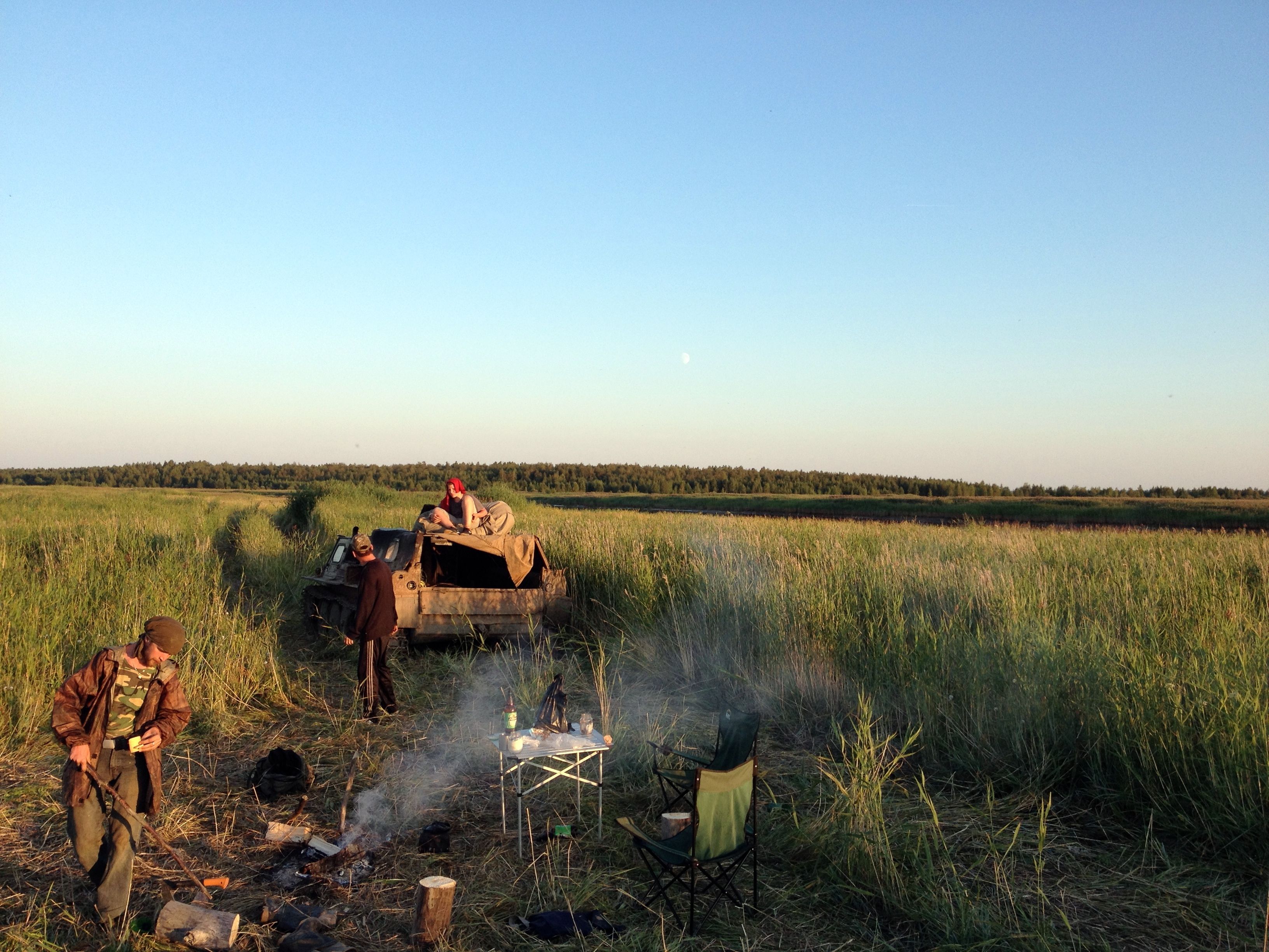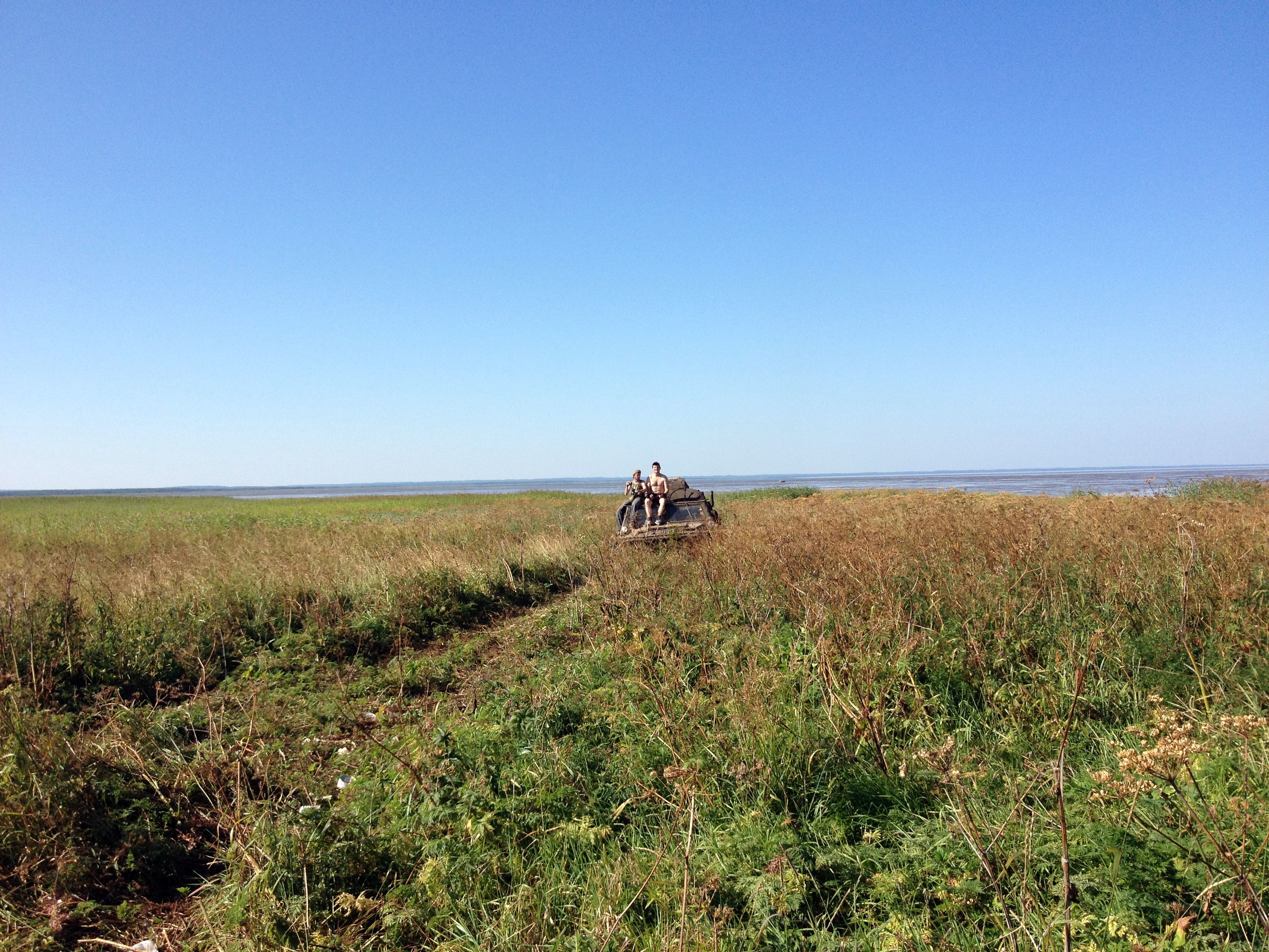 5. В 00-00 пришелся пик отлива, зашли в няшу и тут же сели. Гусянка нас выдернула и мы встали на твердое дно. Вышли из реки сами, трос был прицеплен для страховки, но ухитрились намотать его на передний мост, вырвали тормозную трубку - это оказалось нашей единственной поломкой за все путешествие.
