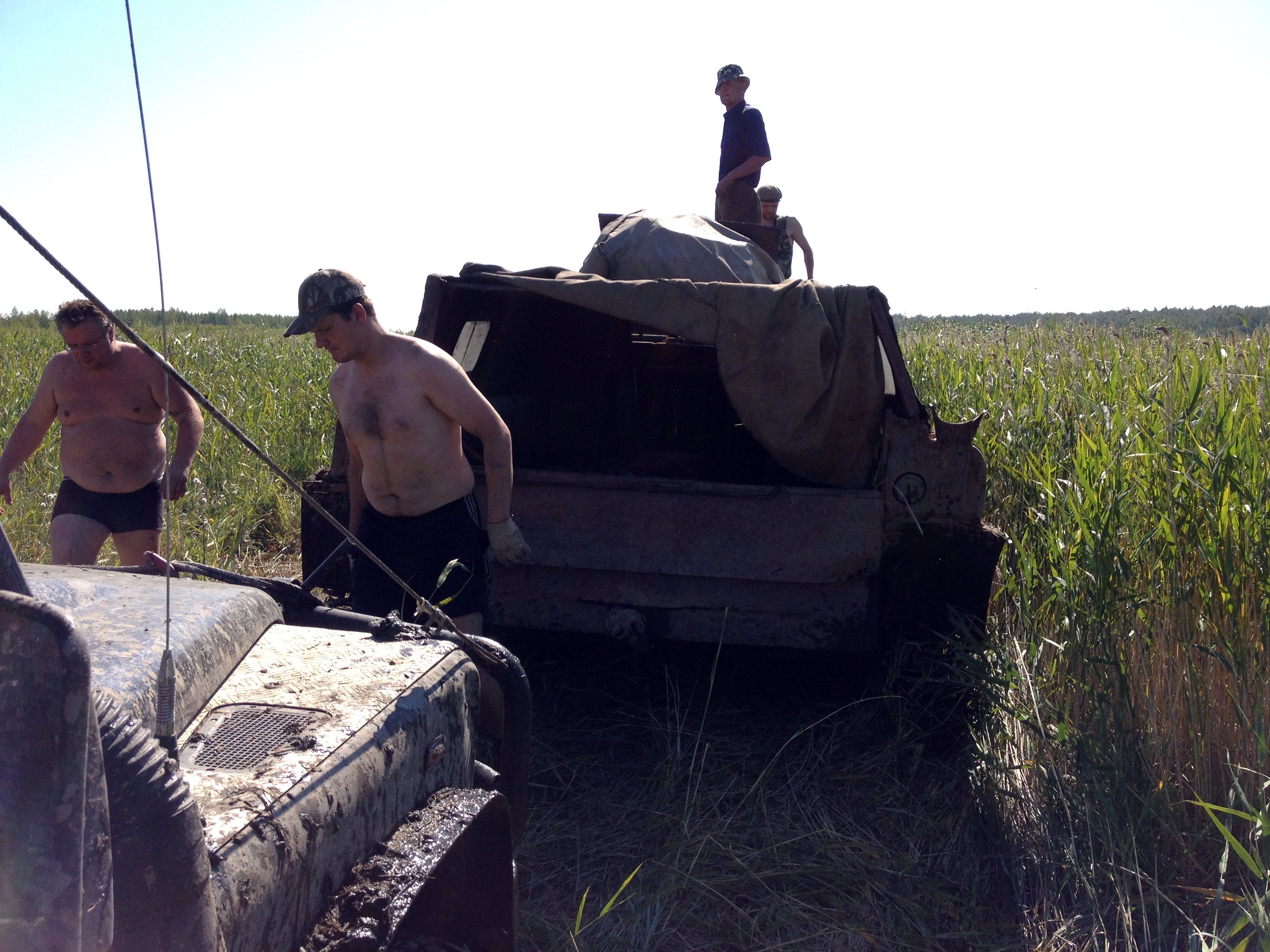 2. Шли так: тростник около 4-х км, ходом, вытягивая удлинитель в двух местах до леса - около 200 метров. Когда поняли, что за 1 день не пройдем, решили возвращаться, но до выхода не дошли около 1 км, положили в промоине машину набок. Залебедиться не смогли, после покладки это вообще стало бессмысленно.