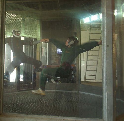 Аэродинамическая труба дает полное ощущение свободного падения, да, но если ты не знаком с принципами "лежания", то сьезжать с потока и падать на сетку будешь постоянно. На фото Примуса - спортсмены.