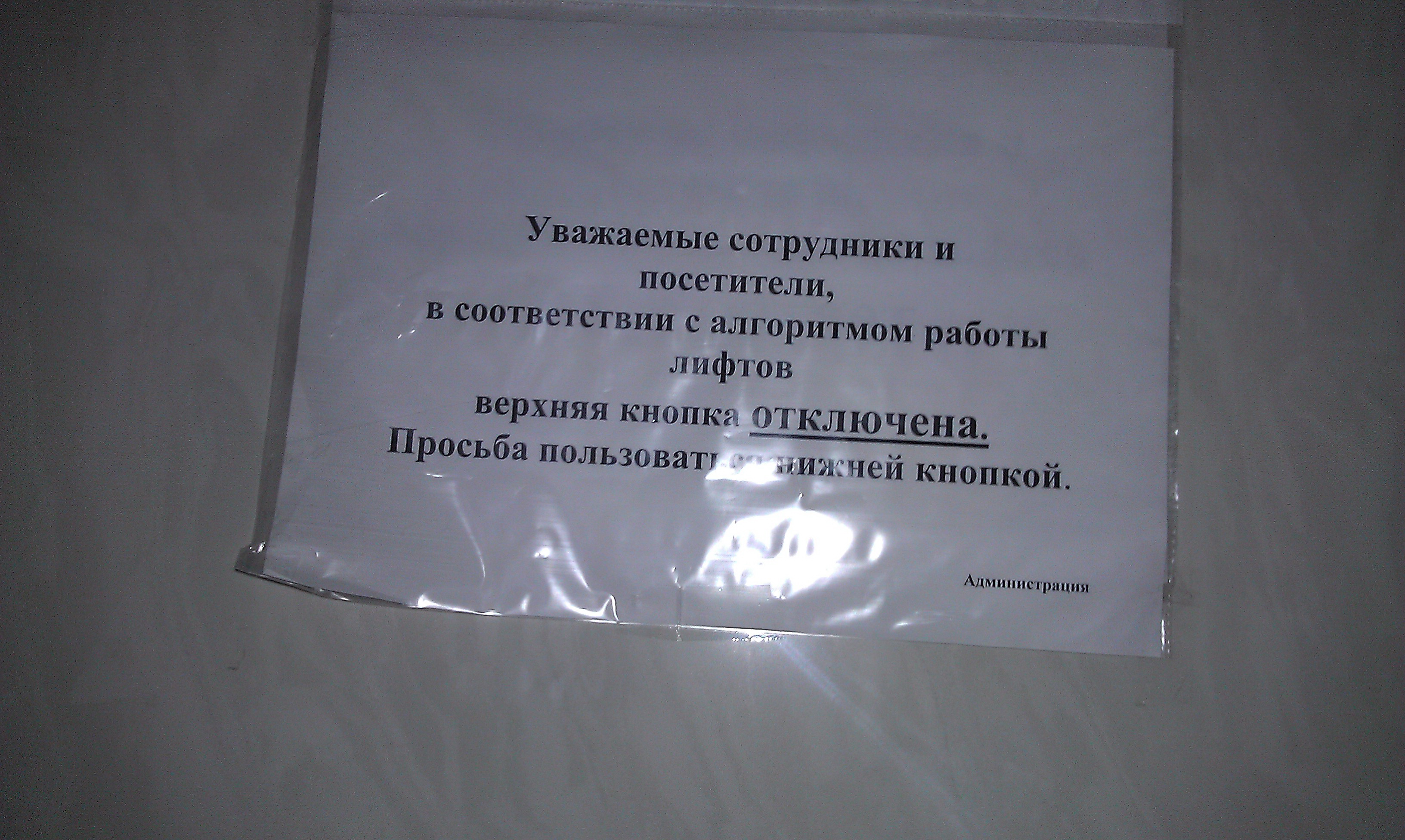 Лифт тупо с 6 этажа не ходит вверх. Но по простому написать "сломано" западло. Мы не ищем легких путей, мы типа люди образованные))))