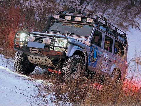 Полуметровые ухабы я беру, что называется, ходом. Тюнинговый “Land Rover” охотно позволяет водителю не осторожничать. Ведь он фактически подготовлен по классу ТР-2 (одна из высших категорий внедорожных трофирейдовых гонок). Это значит, что все уязвимые места машины надежно защищены. Рулевые тяги прикрыты толстой алюминиевой пластиной с вентиляционными отверстиями. Она принимает удары на себя, не мешая отводу горячего воздуха от мотора, и, кстати, грамотно распределяет нагрузки при аварии. На дифференциалы надеты так называемые каски – стальные накладки, позволяющие мостам выдерживать довольно сильные удары. Делают эту броню в одном из российских оборонных НИИ. Прототипом послужили зарубежные разработки, но наши инженеры заложили в них повышенную прочность... Раздаточную коробку оберегает стальной 5-миллиметровый лист. Вместо пластикового бензобака появился стальной, который к тому же вмещает на 58 л больше, чем серийный 75-литровый.