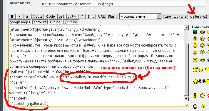 К сожалению, тут нет возможности скопировать только часть кода, а только весь его целиком. Поэтому придется сделать жутко сложную операцию :tongue3: по вырезанию только нужного фрагмента перед вставкой на форум. В нужном по смыслу месте текста сообщения на форуме давим на кнопочку "galleryru2" и между тегами [galleryru2 ][/galleryru2 ]вставляем скопированный в буфер обмена код: