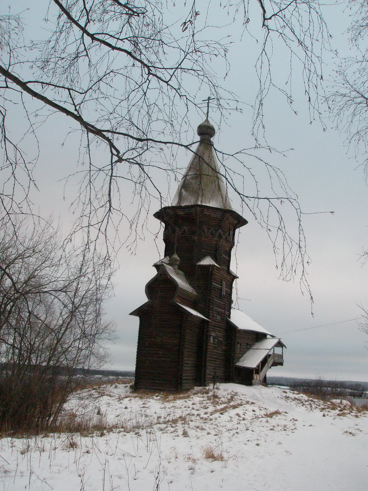 Описать словами красоту строения и место, где она стоит, сложно. С одной стороны, можно сказать, что находится на отшибе, а с другой стороны, на возвышенности берега Онеги. Тишина в округе, будто сгущается, при приближении к зданию. Не роятся толпы туристов, не снуют местные жители…Тишь, да гладь Онеги…Умиротворение, спокойствие, созерцание…Одинокий крест, дополняющий картину, удивил обладателем. Оказывается, стоит он на могиле земского врача, который умер в возрасте 30-ти лет в 1883 году (если ничего не путаю с датами). А удивительно, потому что не принято было хоронить на территории церкви обычных людей. Видимо, хорошим был врач Николай Трошков.