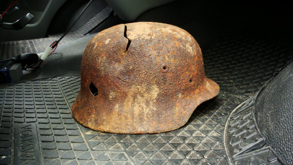 Лен, действительно, похоже на кастрюлю, но это немецкая каска со сквозным осколочным ранением через затылочную часть... От удара она треснула по верху, осколок расколол металл на выходе и остался внутри...
