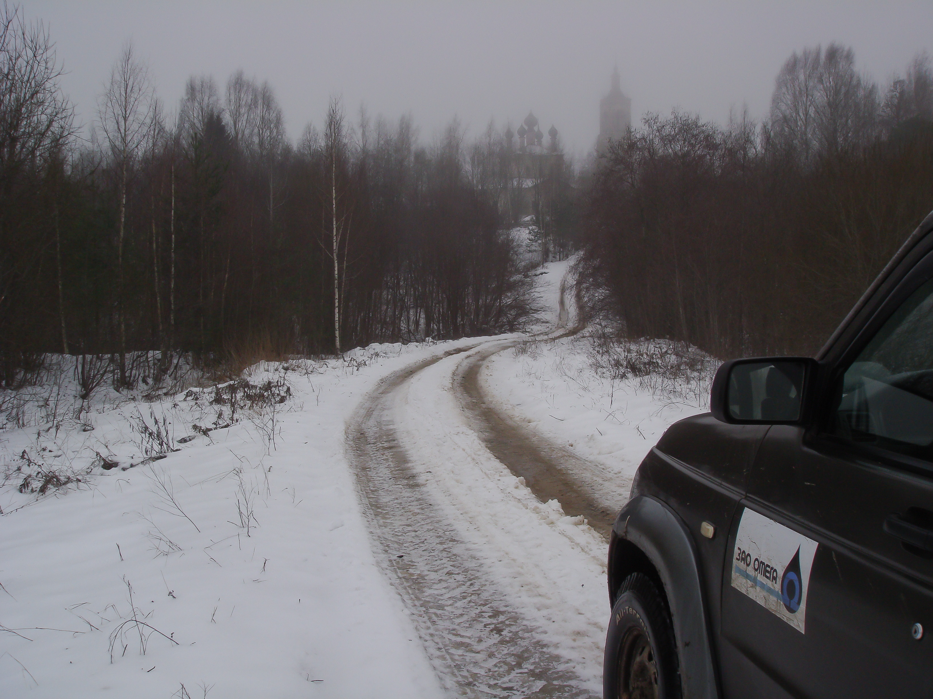 Мы поехали через Углево на Попадьино по тракторной колее. Нашли живописные остатки храма 1814 года. Но организаторы и тут нас надули с картой. Выход на Флоловское-Попадьино находился значительно дальше, чем он был указан на карте. Если бы не охотники, мы бы долго его искали. День вышел замечательным. Все ехалось, когда заканчивался бензин, мы встретили паджерика на 36 тракторах Ф-Бел, купили топлива. Единственное, их 4 машин после 2 дней осталось 2.