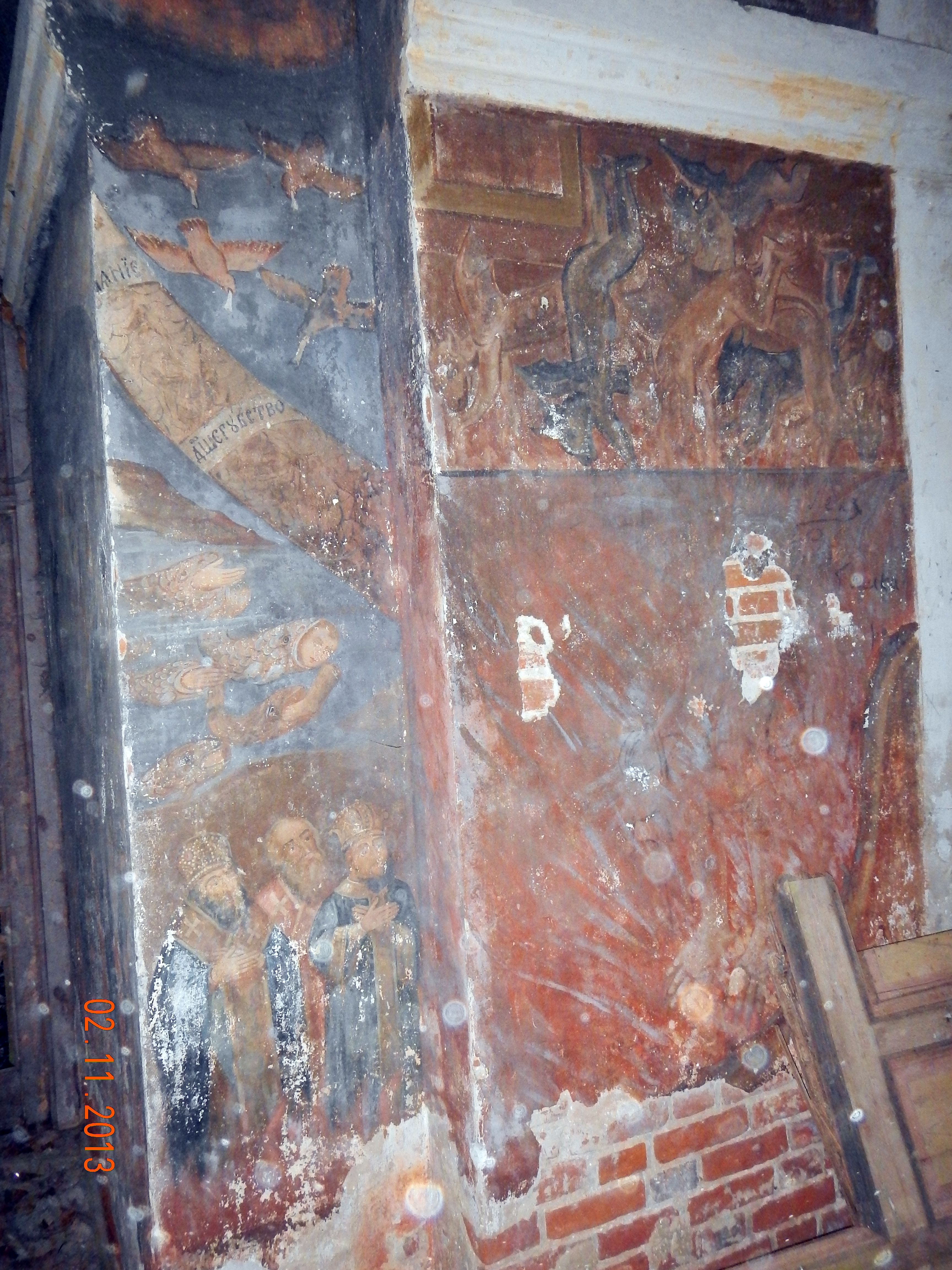 Практически уничтоженная фреска на наружной стене левой церкви.