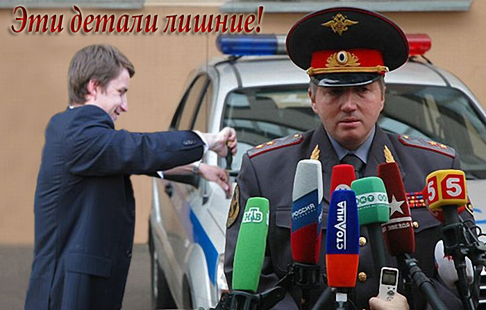 Гаишник открывает один отдел бумажника - там доллары, второй - рубли, третий - удостоверение, в котором написано "Генерал милиции..."